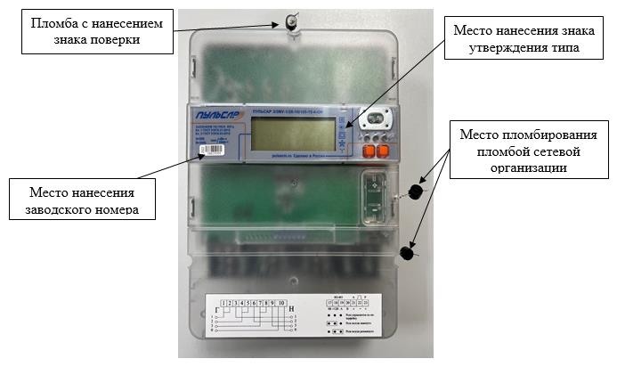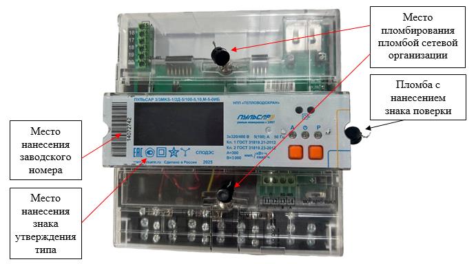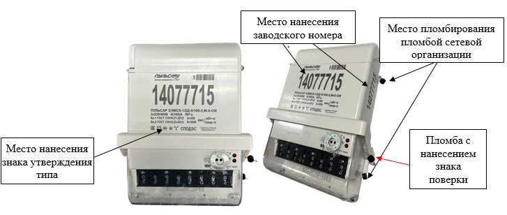 Общий вид счетчиков с универсальной установкой с указанием места ограничения доступа к местам настройки (регулировки), места нанесения знака утверждения типа, места нанесения заводского номера представлен на рисунке 4. Способ ограничения доступа к местам настройки (регулировки) - пломба с нанесением знака поверки.
