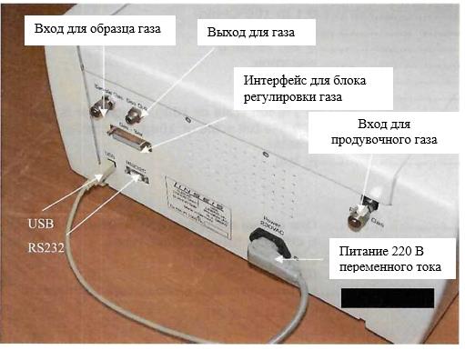 На задней панели термоанализатора расположены вводы для подсоединения внешних устройств, кабеля питания и штуцера для подключения продувочных газов.