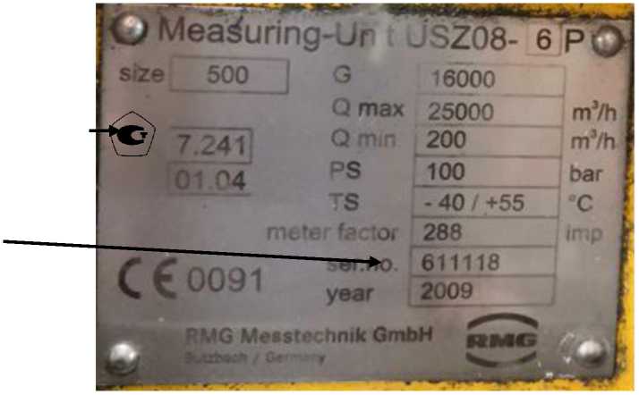 Пломбы, предотвращающие доступ к элементам конструкции, устанавливаются изготовителем счетчика и/или организацией, выполняющей ремонт счетчика. Знак поверки на счетчик не наносится. Заводской номер, состоящий из 6 арабских цифр и год выпуска счетчика наносятся на маркировочную табличку методом лазерной гравировки. Общий вид маркировочной таблички представлен на рисунке 2.