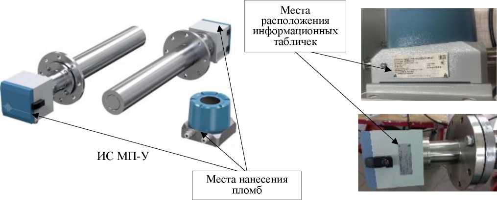 Рисунок 1 - Общий вид расходомера ИС МП-У с указанием мест пломбировки предприятием-изготовителем и расположения информационных табличек