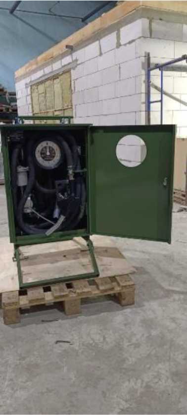 Колонки представляют собой устройство в виде жесткого металлического корпуса, внутри которого размещены узлы и механизмы: ручной поршневой насос, счетчик измерения объема жидкости, фильтрующие элементы, поплавковая камера, раздаточный рукав с краном, всасывающий рукав и индикатор прохождения топлива. Корпус имеет дверцу для сервисного доступа, которая запирается специальным ключом, предотвращая несанкционированное вмешательство и ограничивая доступ к регулируемым частям устройства. Центральное место в конструкции занимает счетчик жидкости СЖ — именно через этот узел проходит учтенное топливо, а его показания выводятся на индикационную панель. Цвет корпуса колонок согласовывается с Заказчиком. Общий вид колонки представлен на рисунке 1.