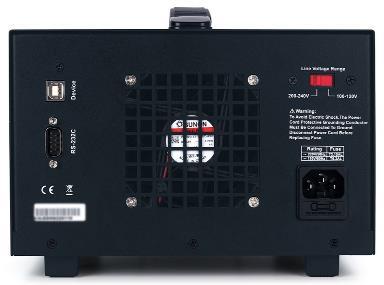 Источники питания выполнены в виде компактного моноблока настольного исполнения со съемным сетевым кабелем питания. На передней панели расположены выходные клеммы, универсальный регулятор, клавиши настройки выходных напряжения/тока, цветной ЖКИ. На задней панели расположен разъем для подключения сетевого шнура питания и порты интерфейсов RS232 и USB и вентилятор системы охлаждения.