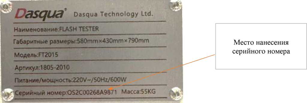 Серийный номер ВИМ FlashTester методом печати в буквенно-числовом формате указывается на маркировочной табличке, расположенной на задней поверхности корпуса машины. Нанесение знака поверки на средство измерений не предусмотрено.