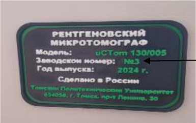 Заводской номер наносится на заднюю панель корпуса на маркировочной табличке методом 3D-печати. Пломбирование микротомографа не предусмотрено. Место нанесения заводского номера приведено на рисунке 2. Нанесение знака поверки на микротомограф не предусмотрено.