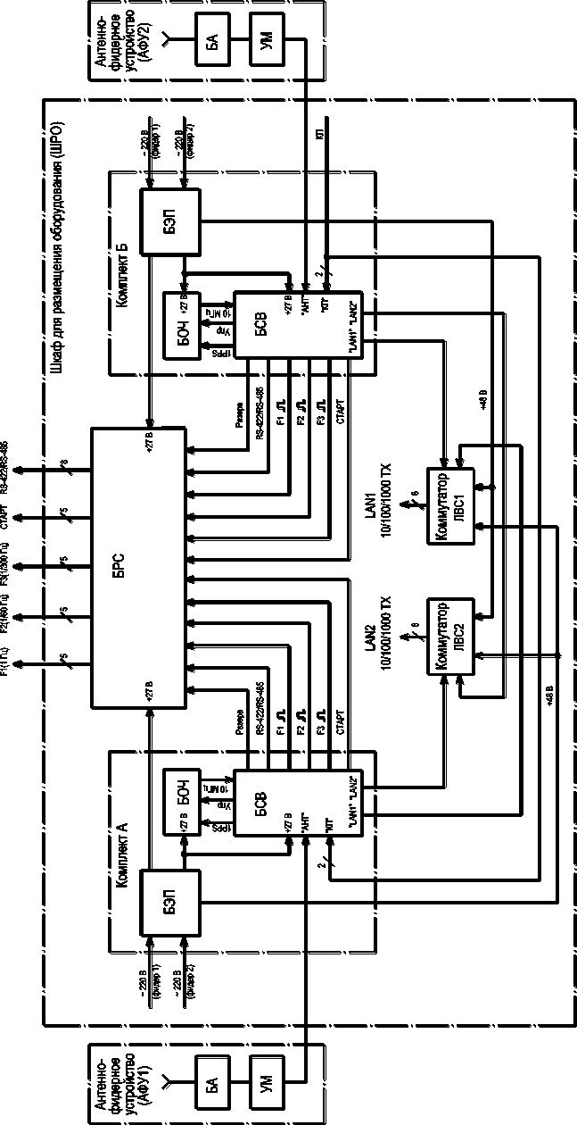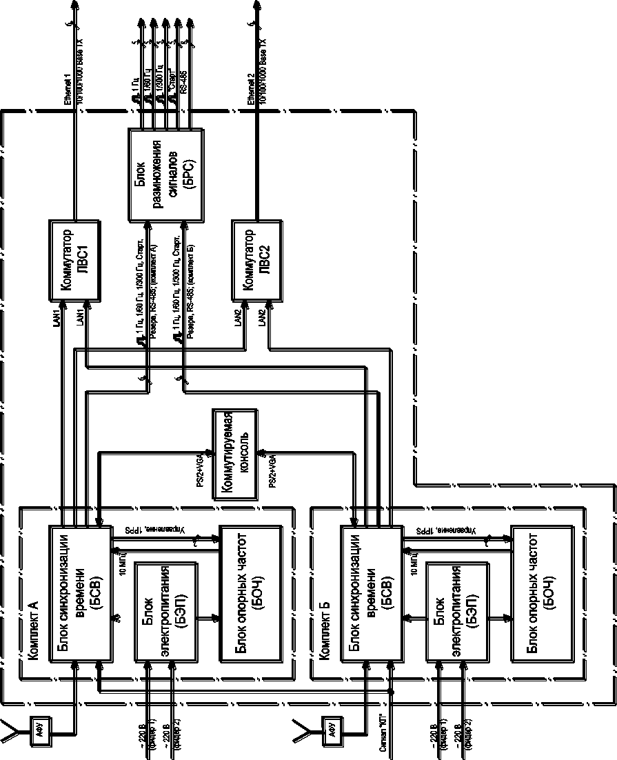 Кроме того, каждый из блоков БСВ Комплекта А и Комплекта Б обеспечивает взаимодействие со средствами вычислительной техники по двум ЛВС Ethernet 10/100/1000 Base-T (LAN1, LAN2), осуществляет синхронизацию внешних средств вычислительной техники по протоколу NTP, а также выдачу сигналов состояния и прием внешних команд управления.
