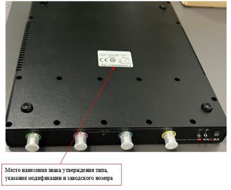 Заводской номер, в формате цифрового обозначения, состоящего из арабских цифр, идентифицирующий каждый экземпляр средства измерений, наносится на нижнюю панель осциллографа на маркировочной табличке типографским способом.