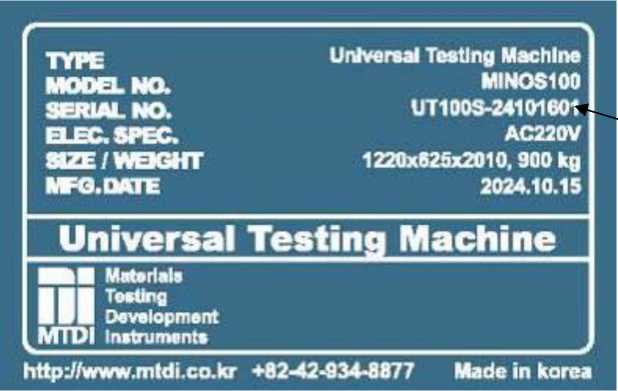 Идентификация машины осуществляется методом визуального осмотра маркировочной таблички, прикреплённой на тыльную сторону основания машины, где отображена информация о типе, модификации, наименовании изготовителя и серийном номере. Серийный номер в виде арабских цифр и букв латинского алфавита наносится на маркировочную табличку методом печати. Серийный номер машины - UT100S-24101601.