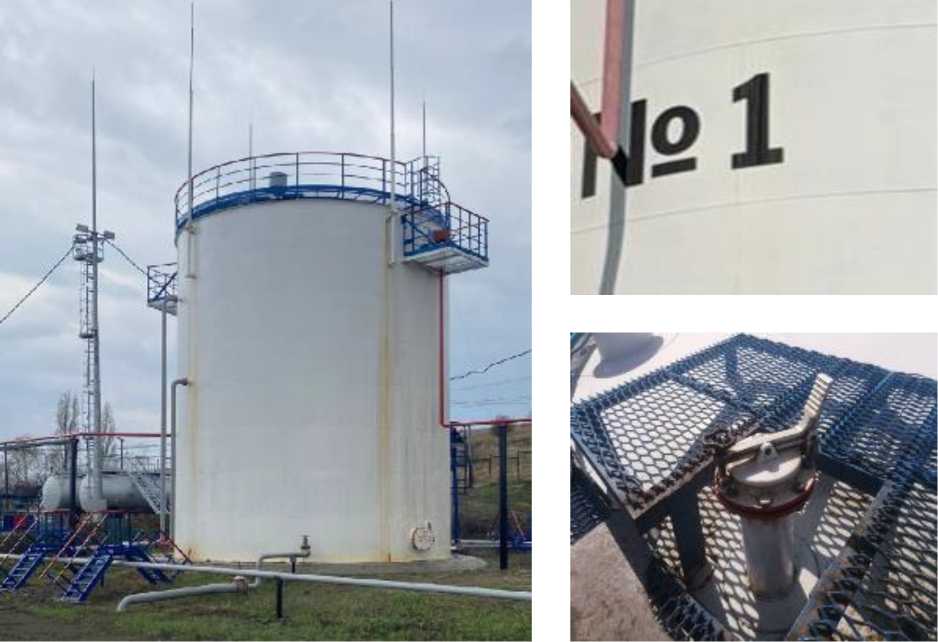 Общий вид резервуара вертикального стального РВС-1000 с указанием места нанесения заводского номера, вид замерного люка резервуара приведены на рисунке 1.