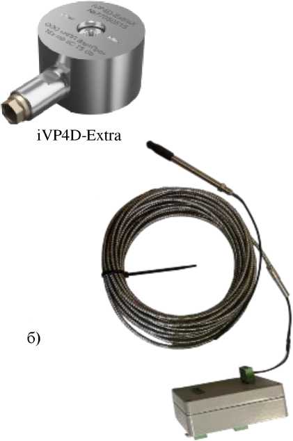 Рисунок 1. Общий вид виброанализаторов интеллектуальных iVP4D в составе с а) первичными преобразователями и б) модулем сопряжения с преобразователем частоты вращения, а также место нанесения модификации и заводского номера