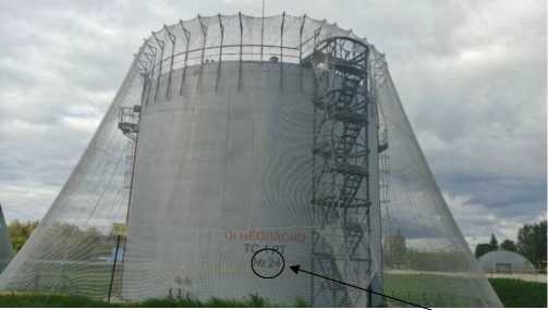 Рисунок 1 - Общий вид резервуара стального вертикального цилиндрического РВС-2000 и места нанесения заводского номера