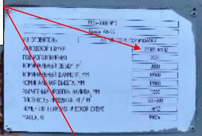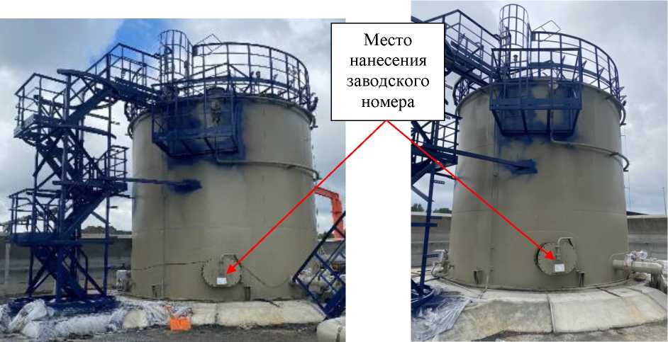Заводские номера в буквенно-цифровом формате, состоящие из цифры и номера позиции резервуара по технологической схеме, аэрографическим способом нанесены на маркировочные таблички, размещенные на лицевой стороне люков.