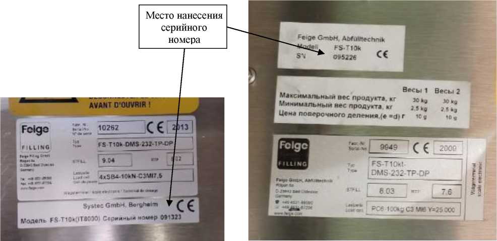 Рисунок 4 - Место нанесения серийного номера на дозаторы весовые дискретного действия FS-T10K а) серийный номер 091323, б) серийный номер 095226