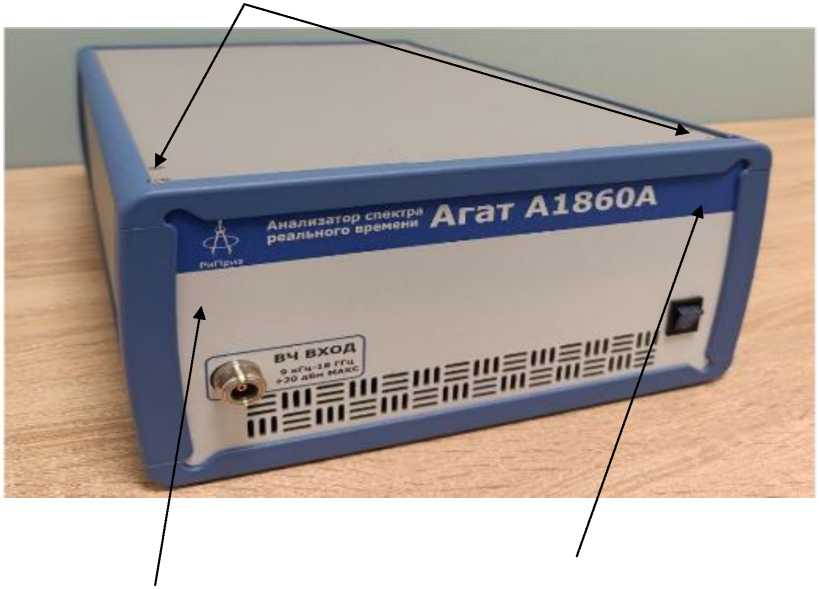 Конструктивно анализаторы спектра реального времени «Агат А1860А» выполнены в виде моноблока в металлическом корпусе. Корпус анализатора усилен металлической рамкой. На корпусе анализатора расположены: