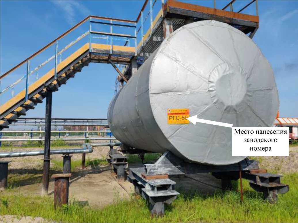 Заводской номер в виде цифрового обозначения нанесён на информационной табличке резервуара методом аэрографии. Нанесение знака поверки на РГС не предусмотрено. Пломбирование РГС не предусмотрено.