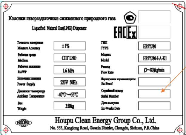 Стандарт предприятия Houpu Clean Energy Group Co., Ltd «Колонки газораздаточные сжиженного природного газа HPJYJ80».