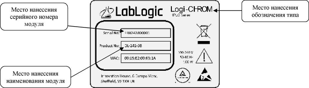 Обозначение типа хроматографа, наименование модуля и серийный номер модуля (в буквенно-цифровом формате) наносится на информационную табличку (шильд) методом печати при изготовлении. Табличка устанавливается на задней панели каждого модуля (кроме поддона), входящего в состав хроматографа.