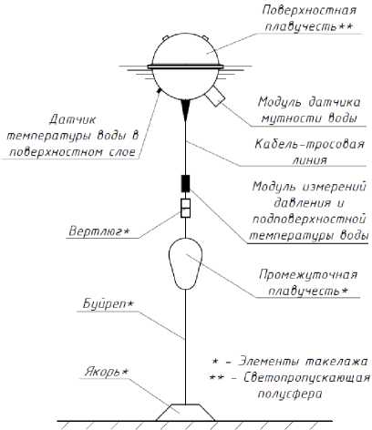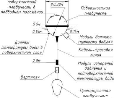 Поверхностная плавучесть представляет собой сферу из поликарбоната, внутри которой размещены модем сети сотовой связи GSM, приемник GPS/ГЛОНАСС, контроллер с энергозависимой системой реального времени RTC, модули измерений температуры поверхностного слоя моря, контроля мутности воды и напряжения источника питания, источник питания, герконовый выключатель. Снаружи плавучести размещены лента выключателя, контакты датчика относительной продолжительности пребывания поверхностной плавучести в подводном положении, узлы ввода кабель-тросовой линии.