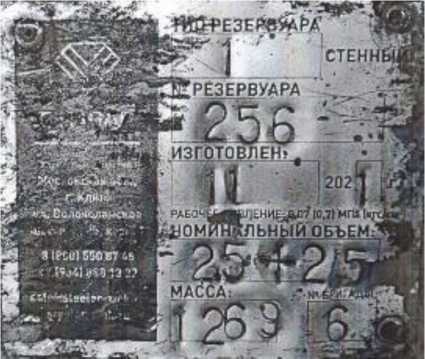 Заводской номер 256 резервуара нанесен изготовителем типографским способом на маркировочной табличке вблизи люка, с целью обеспечения сохранности номера в процессе эксплуатации и подтвержден записью в паспорте, что обеспечивает безусловную идентификацию РГСп.5(2,5+2,5) (рисунок 2).