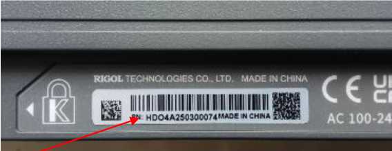 Обозначение модификации осциллографа наносится на лицевую панель методом шелкографии (рисунок 1). Уникальный заводской номер с 14-значным цифробуквенным обозначением наносится в виде самоклеящейся этикетки на заднюю панель осциллографов (рисунки 2 и 4).