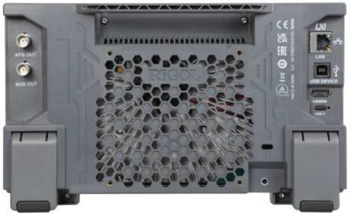 На задней панели (рисунки 2, 3) размещены разъемы выхода AUX OUT, интерфейсы HDMI, LAN, USB DEVICE (внешнее управление), разъем выхода встроенного генератора AFG OUT (для модификаций DHO914S и DHO924S), разъемы питания USB Type-C и заземления.