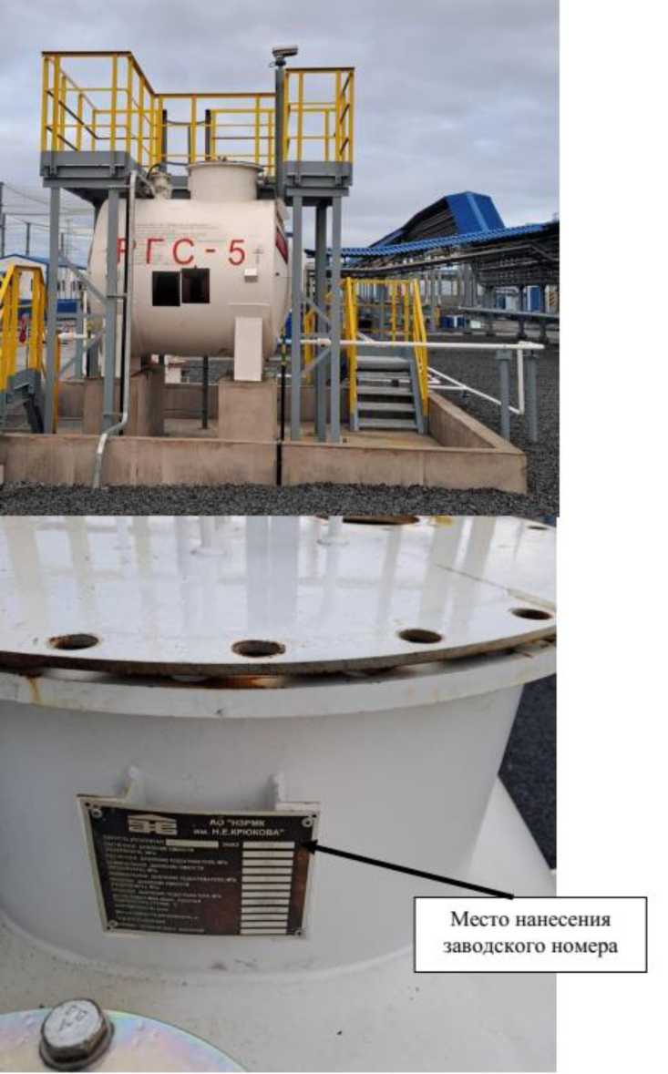 Заводской номер резервуара в виде цифрового обозначения, состоящий из арабских цифр, нанесен ударным способом на маркировочную табличку, прикрепленную к горловине резервуара и в паспорт типографским способом.