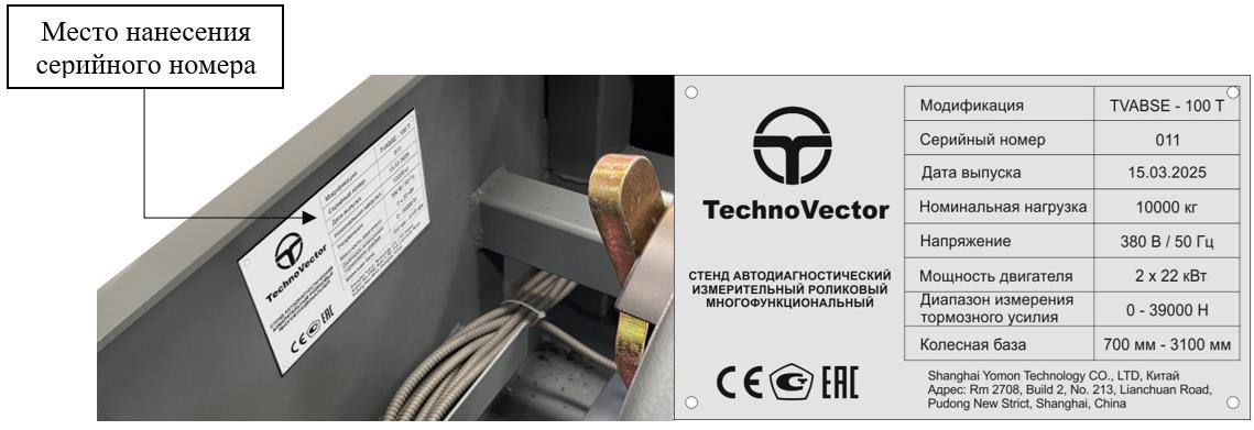 Рисунок 5 - Общий вид маркировочной таблички стендов автодиагностических измерительных роликовых многофункциональных TechnoVector и место нанесения серийного номера