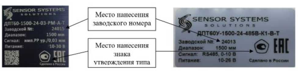 наносится типографским способом в виде наклейки либо методом гравировки на корпус датчика, на титульный лист руководства по эксплуатации и паспорт датчика.