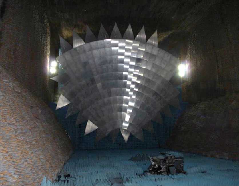 На рисунке 1 представлен вид на зеркало коллиматора МАРК-12. Облучатели коллиматора исследуемого диапазона частот автоматически выставляются в фокус зеркала коллиматора при помощи ОПУ карусельного типа.