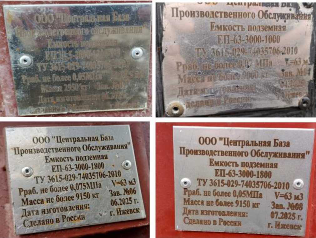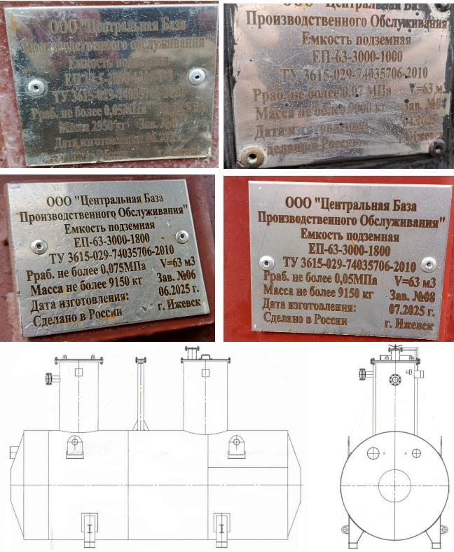 Резервуары изготовлены в следующих модификациях: ЕП 12,5-2000-1300-1-3 с заводским номером 07, ЕП 63-3000-1000 с заводским номером 04, ЕП 63-3000-1800 с заводскими номерами 06, 08.
