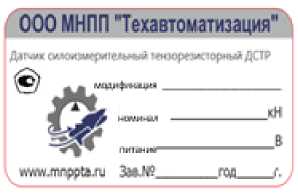 На силовую часть датчика с боковой стороны при помощи клея устанавливается маркировочная табличка, содержащая следующую информацию: товарный знак предприятия-изготовителя, модификация датчика, номинальная нагрузка, напряжение питания, заводской номер, год выпуска, знак утверждения типа. Заводской номер в виде цифрового кода наносится любым удобным технологическим способом.