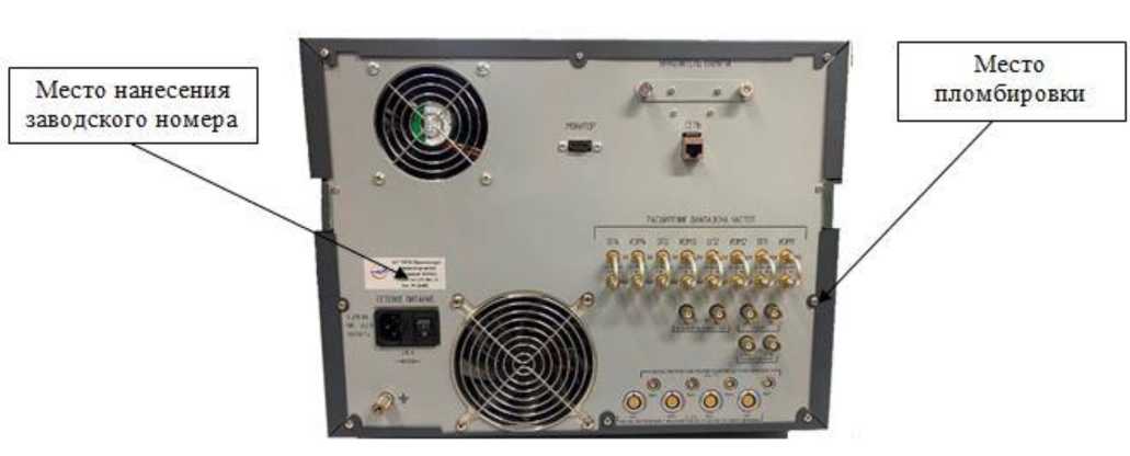 Рисунок 3 - Внешний вид задней панели анализаторов цепей векторных с указанием места пломбировки от несанкционированного доступа и нанесения заводского номера