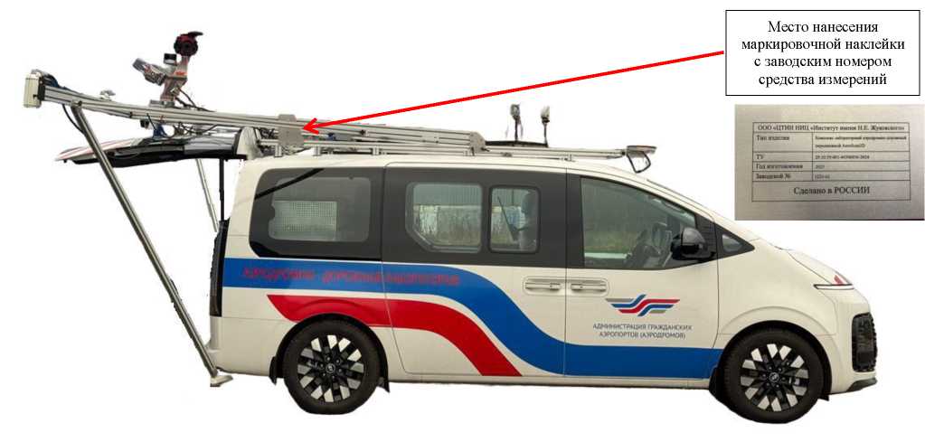 Рисунок 1 - Комплексы лабораторные аэродромно-дорожные передвижные AeroScan3D: а) общий вид измерительного блока; б) общий вид комплекса, установленного на транспортное средство и место нанесения заводского номера