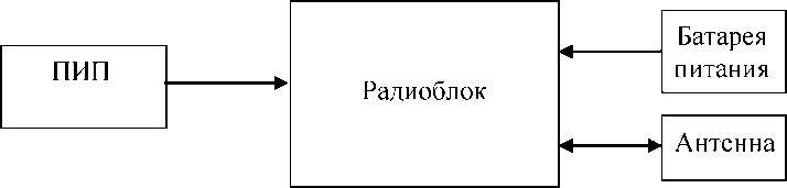 Принцип действия заключается в измерении поступающих от первичных преобразователей (ПИП) в радиоблок электрических сигналов (рисунок 1), в котором полученная информация преобразуется в радиотелеметрический сигнал несущей частоты, представляющий последовательность радиоимпульсов, следующих с частотой суперизации (поднесущая частота). Последовательность суперирующих импульсов является частотно-манипулированным сигналом. Частота следования суперирующих импульсов принимает два значения, отличающихся на величину девиации, и определяется последовательностью модулирующих видеоимпульсов, период следования которых пропорционален измеряемым величинам. Частота следования суперирующих импульсов от 775 до 825 кГц. Плотность потока энергии излучения передатчика не менее 1,5 • 10-3 Вт/м2. Чувствительность приемопередатчика не более минус 64 дБ.