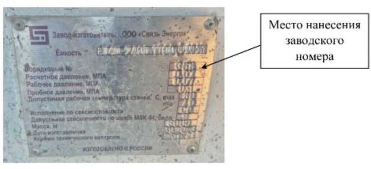 Заводской номер резервуара в виде цифрового обозначения, состоящий из арабских цифр, нанесен ударным методом на маркировочную табличку, прикрепленную к внешней поверхности горловины резервуара (рисунок 1) и в паспорт типографским способом.