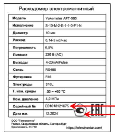 Yokemeter AFT-500-Х1-Х2-Х3-Х4-Х5-Х6-Х7-Х8-Х9-Х10, где: Х1 – исполнение Х2 – диаметр условного прохода Х3 – материал электродов Х4 – аналоговый выходной сигнал Х5 – материал футеровки Х6 – питание Х7 – цифровой выходной сигнал Х8 – кольцо заземления Х9 – номинальное давление Х10 – «N» - общепромышленное исполнение На испытании представлены: Yokemeter AFT-500-S-10-M-2-E-1-1-0-P1-N Yokemeter AFT-500-L-200-M-2-C-1-1-0-P3-N Yokemeter AFT-500-L-2000-M-2-C-1-1-0-Pn-N |
