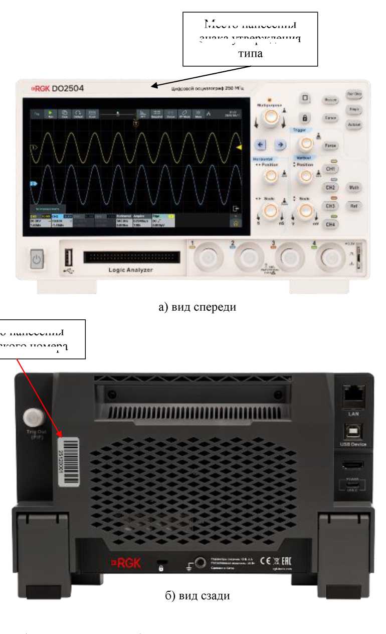Общий вид осциллографов с указанием места нанесения знака утверждения типа, места нанесения заводского номера представлен на рисунке 1. Нанесение знака поверки на осциллографы в обязательном порядке не предусмотрено. Пломбирование мест настройки (регулировки) приборов не предусмотрено.