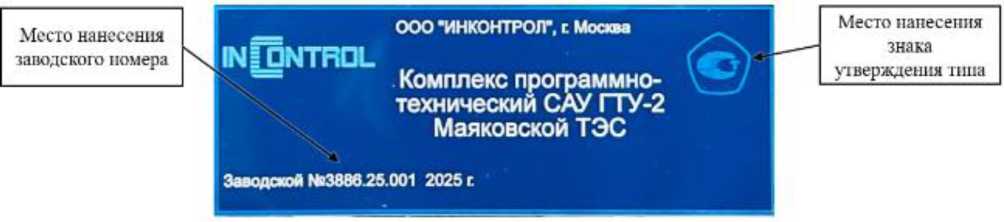 Заводской номер 3886.25.001 комплекса, состоящий из арабских цифр, и знак утверждения типа нанесены методом лазерной гравировки на маркировочную табличку, расположенную на двери шкафа управления комплекса. Общий вид маркировочной таблички и место нанесения заводского номера представлены на рисунке 1. Общий вид комплекса представлен на рисунке 2.