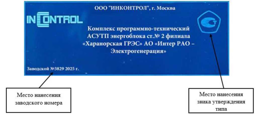 Заводской номер 3829 комплекса, состоящий из арабских цифр, нанесены методом лазерной гравировки на маркировочную табличку, расположенную на двери шкафа управления комплекса. Места нанесения заводского номера и знака утверждения типа, а также общий вид маркировочной таблички комплекса приведены на рисунке 1.