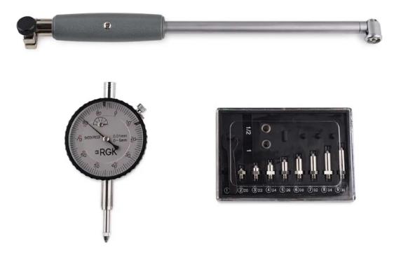 Нутромеры состоят из следующих элементов: державки, индикатора часового типа, удлинительного стержня, измерительных поверхностей с двухконтактным касанием к измеряемому изделию и центрирующего мостика.