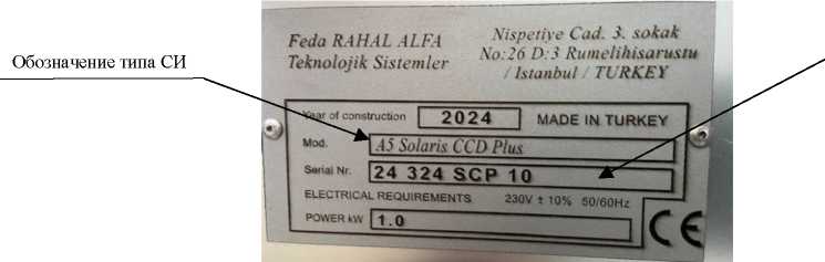 Маркировка спектрометра наносится методом лазерной гравировки на фирменной табличке, которая крепится на задней панели спектрометра и содержит следующую информацию: наименование и адрес предприятия-изготовителя, наименование страны-изготовителя, год изготовления СИ, обозначение типа СИ, заводской номер, напряжение питания, частота сети электропитания, потребляемая мощность.