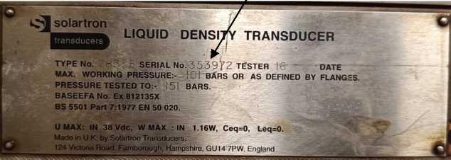 К преобразователям плотности данного типа относятся преобразователи плотности жидкости тип 7835 с серийными номерами 353872, 353873, 353972, 353979. Формат серийного номера - цифровой. Серийный номер преобразователя плотности нанесен методом лазерной гравировки на идентификационную табличку, размещенную на боковой стороне электронного преобразователя, указанный на рисунке 2.