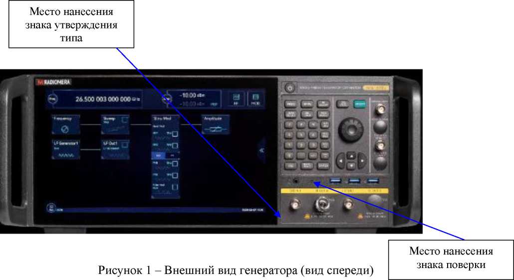 Общий вид генератора, места пломбировки от несанкционированного доступа, нанесения наклейки «Знак утверждения типа», и заводского номера представлены на рисунках 1, 2. Заводской номер, идентифицирующий генератор, нанесен на информационную табличку, размещенную на задней панели методом наклейки в формате «зав. №Rxxxxxxx».