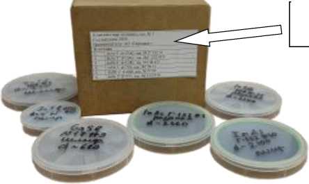 Заводской номер комплекта в цифровом формате и перечень образцов (с указанием их обозначений и заводских номеров), указаны на шильдике размещенном на упаковке комплекта, а также в паспорте на комплект. К комплекту данного типа относится комплект мер толщины зав. № 1, в состав входит 6 мер толщины: InAs 3’ d=2360, № Г-132 #1; InAs 3’ d=2060; № Г-132 #10; InSb 3’ d=1280, № 108 #31; InSb 3’ d=750, № 108 #1; GaSb 3’ d=680, № 17 #9; InSb 2’ d=575, № 1110 #10. Место нанесения заводского номера на комплект мер толщины представлено на рисунке 1.