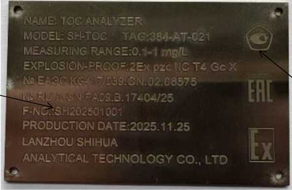 На боковой панели анализаторов расположена маркировочная табличка, которая содержит сведения о заводском номере, дате выпуска и маркировке взрывозащиты. Формат заводского номера - буквенно-цифровой, состоящий из латинских букв и арабских цифр. Информация на маркировочную табличку наносится методом лазерной печати. Маркировочная табличка анализаторов приведена на рисунке 2.