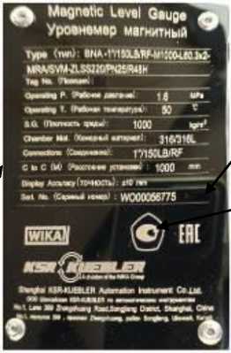 Сокращённое условное обозначение и серийный номер уровнемера в буквенноцифровом формате наносятся на информационную табличку, размещенную на байпасной трубе методом лазерной гравировки.
