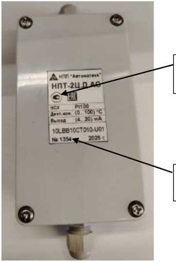 Заводской номер, в виде цифрового обозначения, состоящего из арабских цифр, наносится типографским способом на идентификационную наклейку, расположенную на корпусе преобразователей.