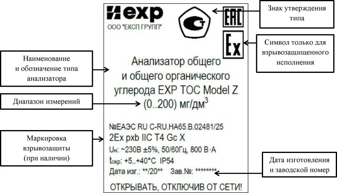 На боковой панели анализатора расположена маркировочная табличка, которая содержит следующую информацию: