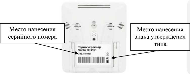 Общий вид термогигрометров с указанием места нанесения знака утверждения типа, места нанесения серийного номера представлен на рисунке 1. Нанесение знака поверки на термогигрометры не предусмотрено. Пломбирование мест настройки (регулировки) термогигрометров не предусмотрено.